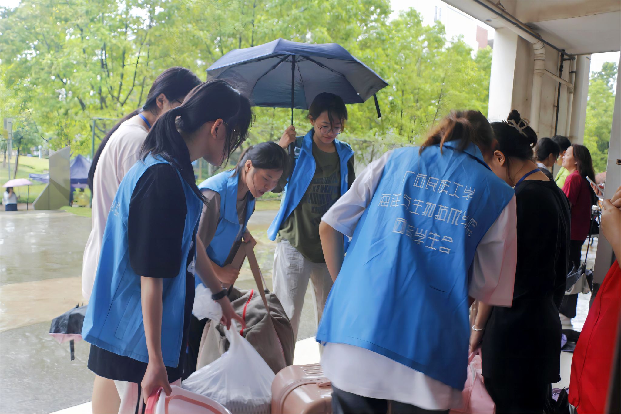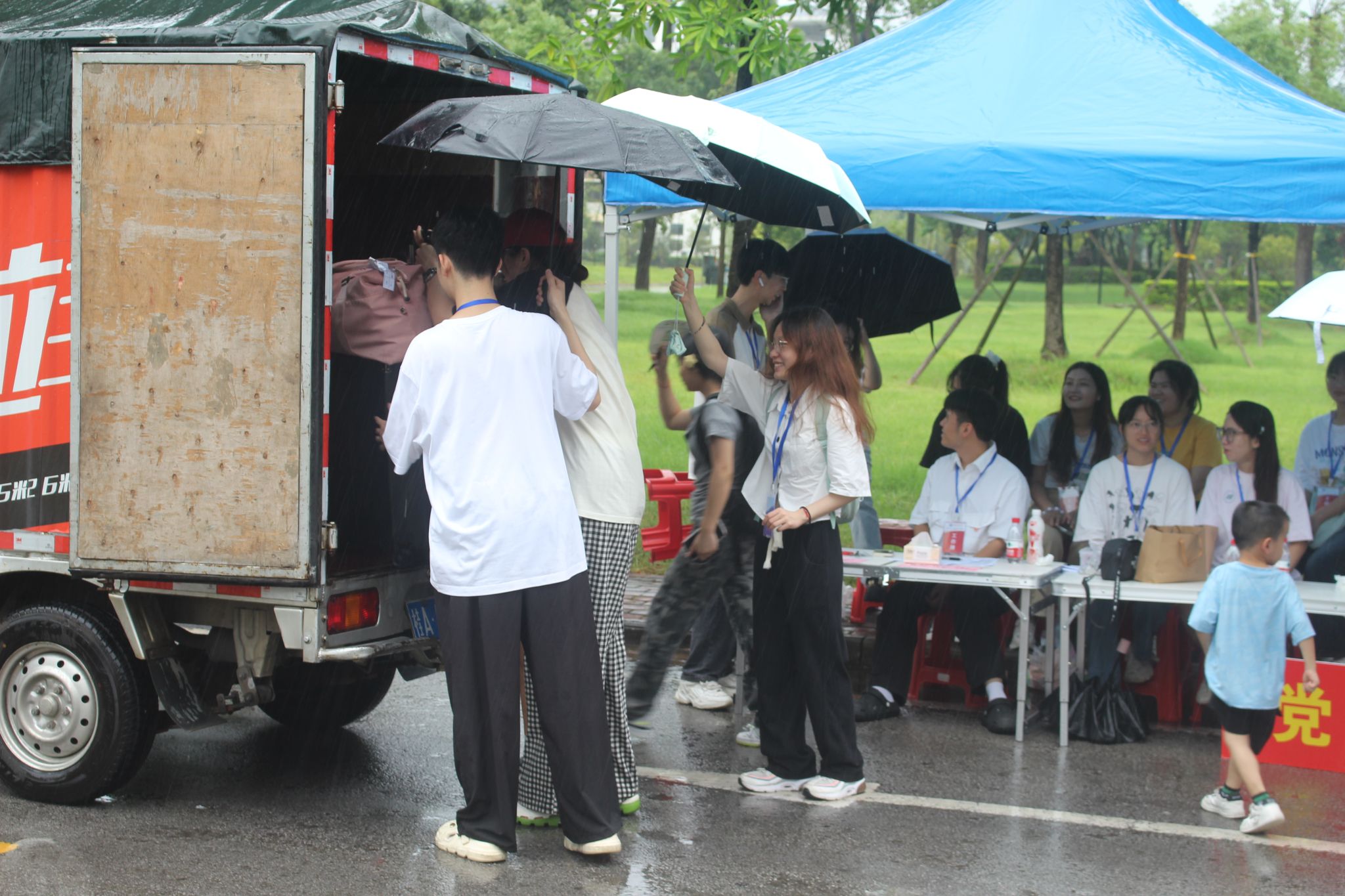 尽管天气不佳,志愿者们仍以饱满的热情迎接新生,协助他们搬运行李,有条不紊地引导新生前往注册点报到。注册点的工作人员各尽其职,帮助每一位新生顺利完成文件审核、身份验证和注册登记等环节,耐心解答新生疑惑。