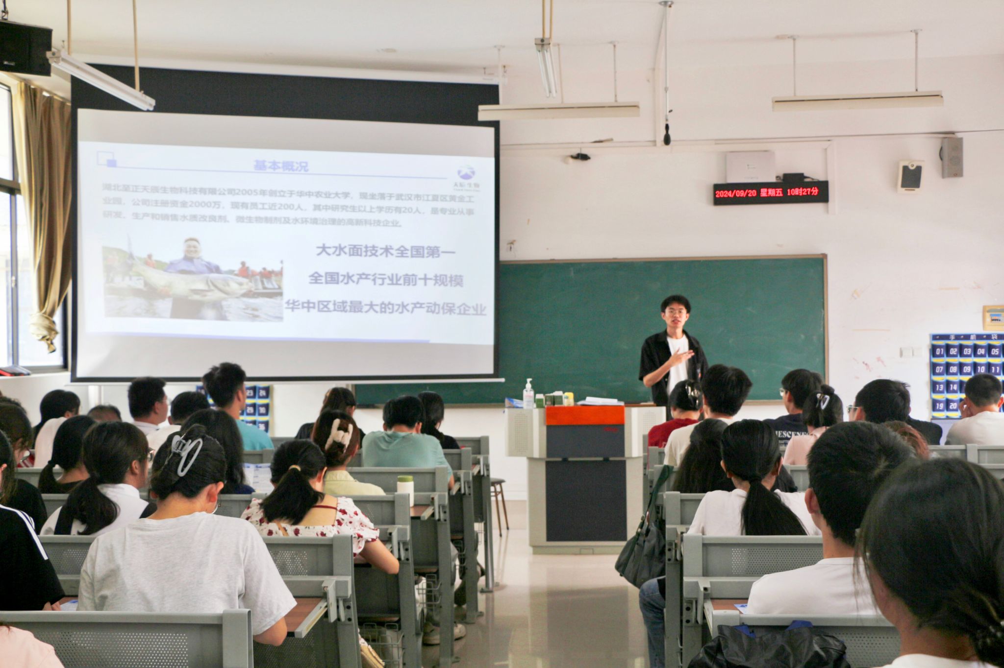 会上,李杰首先以播放宣传片的形式向同学们展示了公司背景、发展理念、经营模式、管理制度以及业务发展方向等方面的内容。随后,李杰详细介绍了公司在华中区域水产动保、水质调节、水产疾病治疗和预防、水产养殖等领域的专业优势,阐述了各个岗位的业务范围、招聘要求、薪酬福利、培养计划及职业发展路径。最后,同学们就公司文化、工作环境、发展前景等方面进行提问,李杰经理耐心予以解答,并鼓励同学们要勇于尝试,敢于创新,不断提升自己的综合素质和专业技能。
