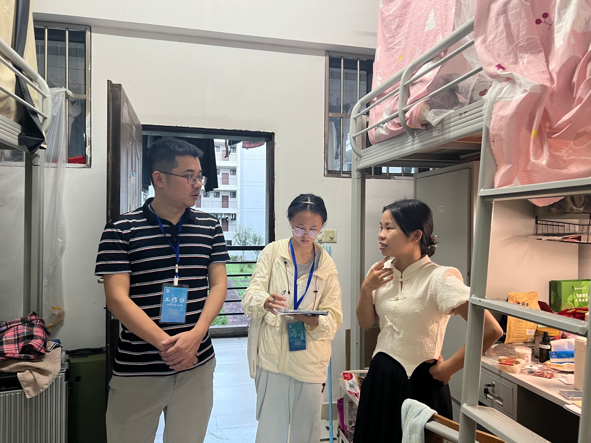 在检查过程中,林南新重点检查宿舍的卫生状况和是否有使用大功率电器的情况,对检查中发现的安全隐患和存在的问题进行提醒,提出整改要求。林南新细心了解学生在宿舍期间的生活状况,认真倾听同学们遇到的问题,并进行耐心的解答,同时进行安全教育和引导,嘱咐同学们天气变冷,注意预防流感和传染病,要及时开窗通风、保持宿舍整洁。