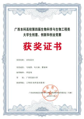 马瑞茜同学学习态度端正,刻苦努力。在入学以来,一直保持学年专业课成绩与综测成绩排名专业前三,并且多次获得优秀学生特等奖学金和三好学生等荣誉。在夯实专业基础的同时,她也积极探索,与时俱进。在科研上,大三学年作为主要参与者,成功获得国家发明专利《一株哈尔滨乳杆菌及其在酸粥发酵中的应用》。与此同时,她也积极参加学科专业竞赛,获得广西生物科学与生物工程类大学生创意竞赛二等奖等4项自治区级奖项,做到了将专业知识与实践相结合。