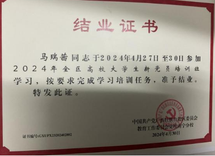 马瑞茜同学在思想上积极向党组织靠拢,始终以党员的标准严格自律。她勤奋学习党的理论知识,不断提升自身的政治觉悟。她曾获得广西民族大学“优秀共青团员”的荣誉称号。通过持续不懈的努力,她在大三学年成为了一名中共预备党员。在2024年4月代表学校参加全区高校大学生新党员培训班,并顺利结业。
