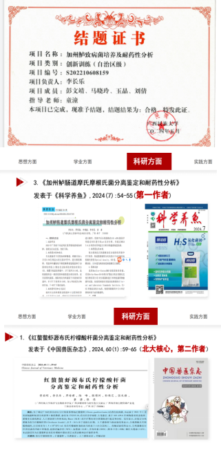 学术方面,李长乐积极参加各种学术竞赛和科研活动,具有团队协作实践,解决问题的能力和创新思维。在大二学年加入张琴老师实验室并通过团队协作发表论文两篇,区级大创项目结题一项,大三学年跟随金壳育绿团队参加中国国际大学生创新大赛(2024)“数广集团杯”广西赛区选拔赛,并获得铜奖。
