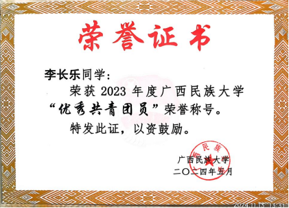 李长乐在思想上积极向党组织靠拢,始终严格要求自己。她勤奋学习党的理论知识,不断提升自身的政治觉悟,积极发挥共青团员的模范带头作用,于2023年荣获广西民族大学“优秀共青团员”称号。