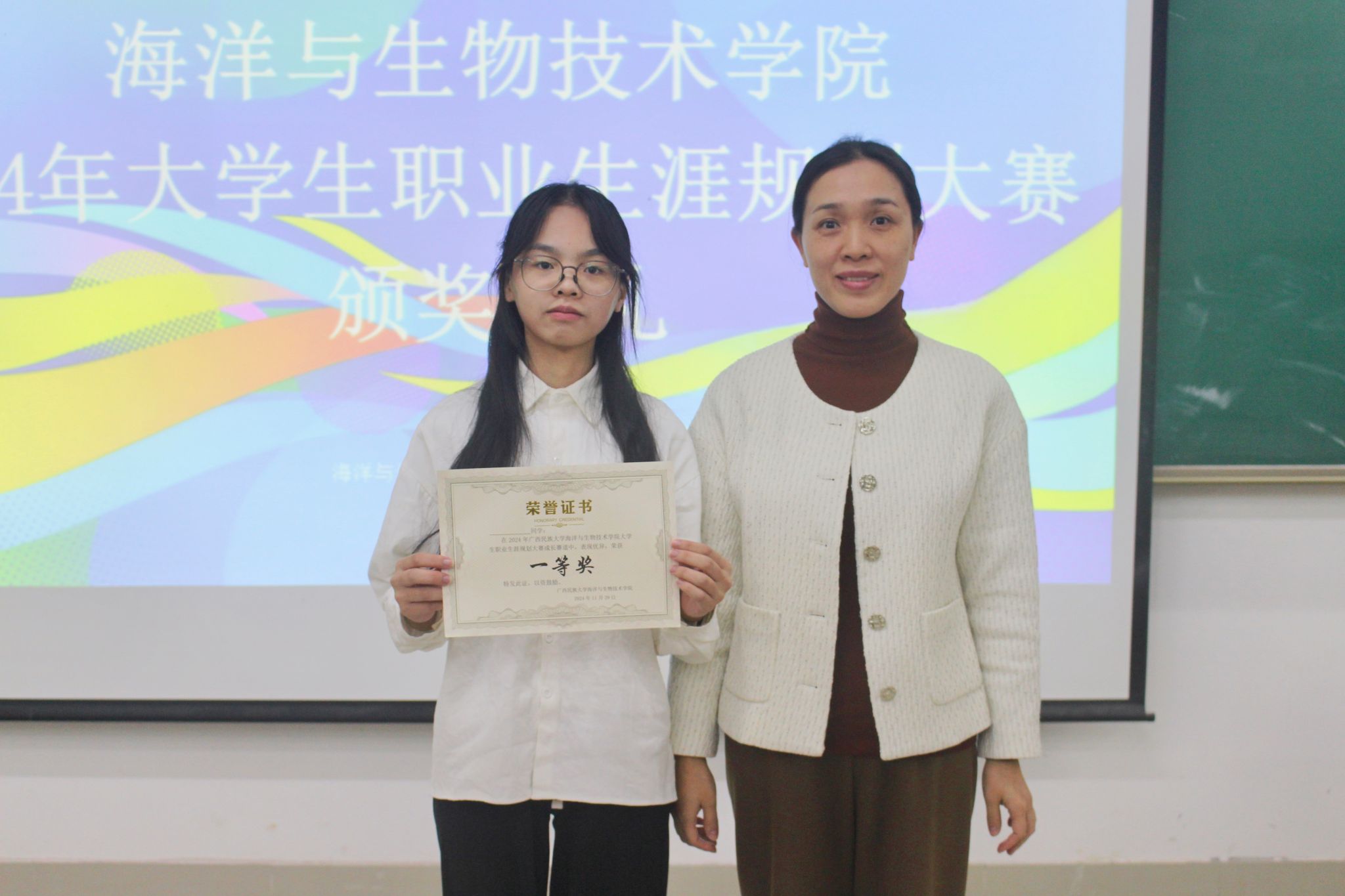 经过激烈角逐, 2023级生物技术05班冯美琳获得成长赛道一等奖,2022级海洋科学01班汪思伟、2023级生物技术02班李心怡获得二等奖,2024级生物技术02班陆万良、2024级海洋科学01班李晨曦、2023级生物技术02班梁建华获得三等奖,2024级生物技术03班翁诗杰、2022级生物工程02班丘葵茹获得优秀奖。2024级生物与医药专业刘裕穗获得就业赛道上一等奖,2021级生物技术03班袁秀彩获得二等奖,2022级生物技术03班吴爱秋获得三等奖。