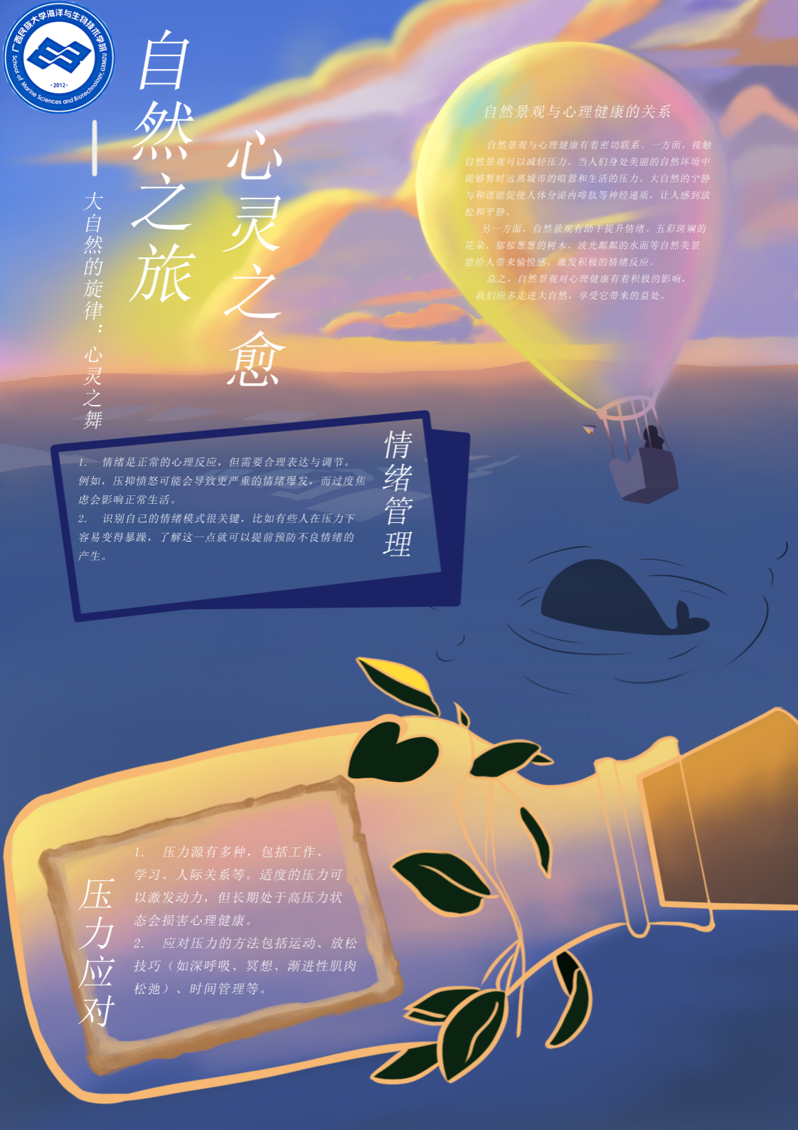 本次活动主要展示了主题为“大自然的旋律:心灵之舞”宣传电子手抄报、“巧遇生命的力量,记录动植物界的心理医生”心理摄影两项内容,同学们的作品生动展现了我们身边一草一木、一虫一兽的蓬勃生命力,将自然界中万物所蕴含的生命力与坚韧不拔的精神,以细腻而生动的方式呈现出来。优秀的作品激发同学们对心灵深处的探索,鼓励他们进行更为深刻和细腻的思考,增强同学们对心理健康的重视。