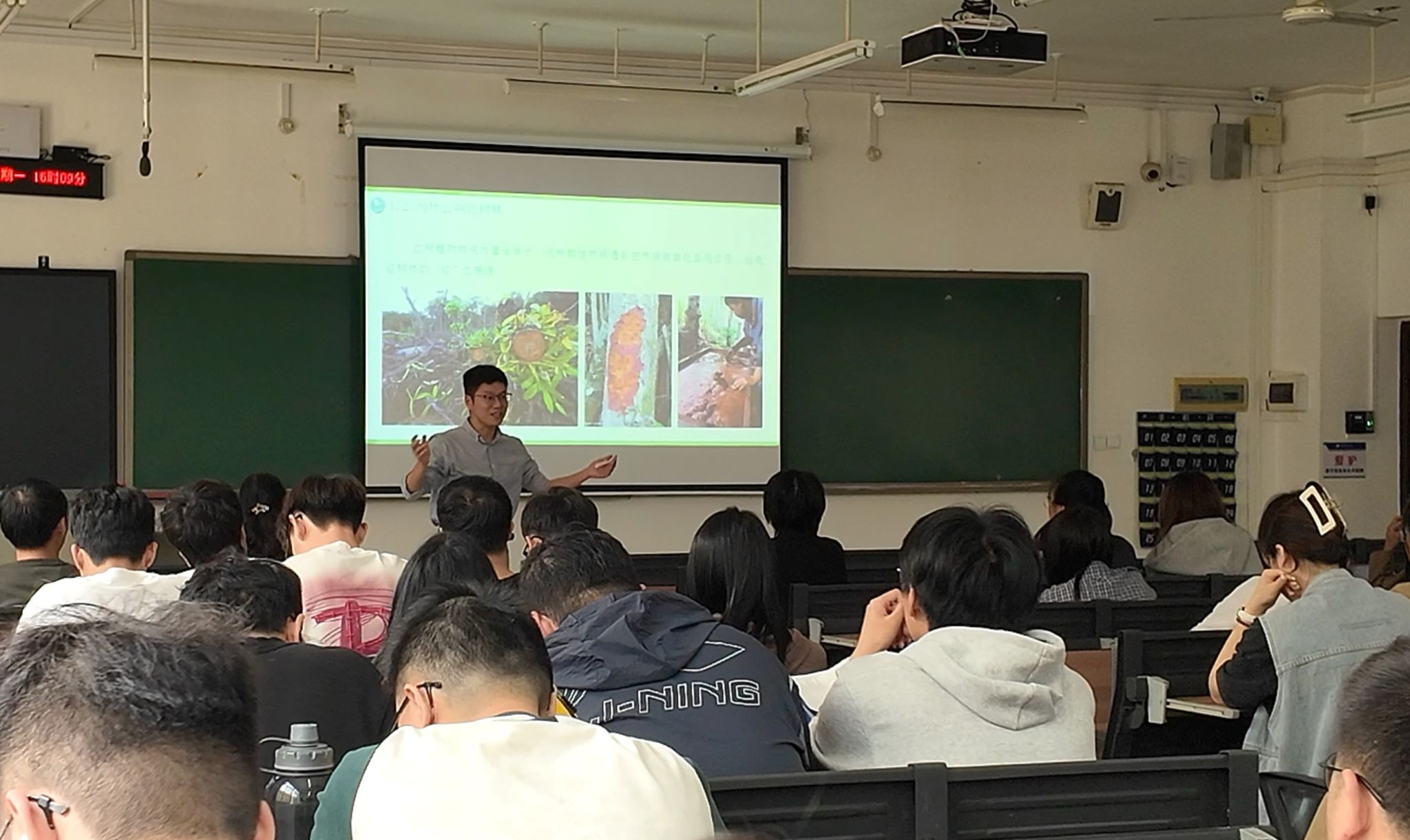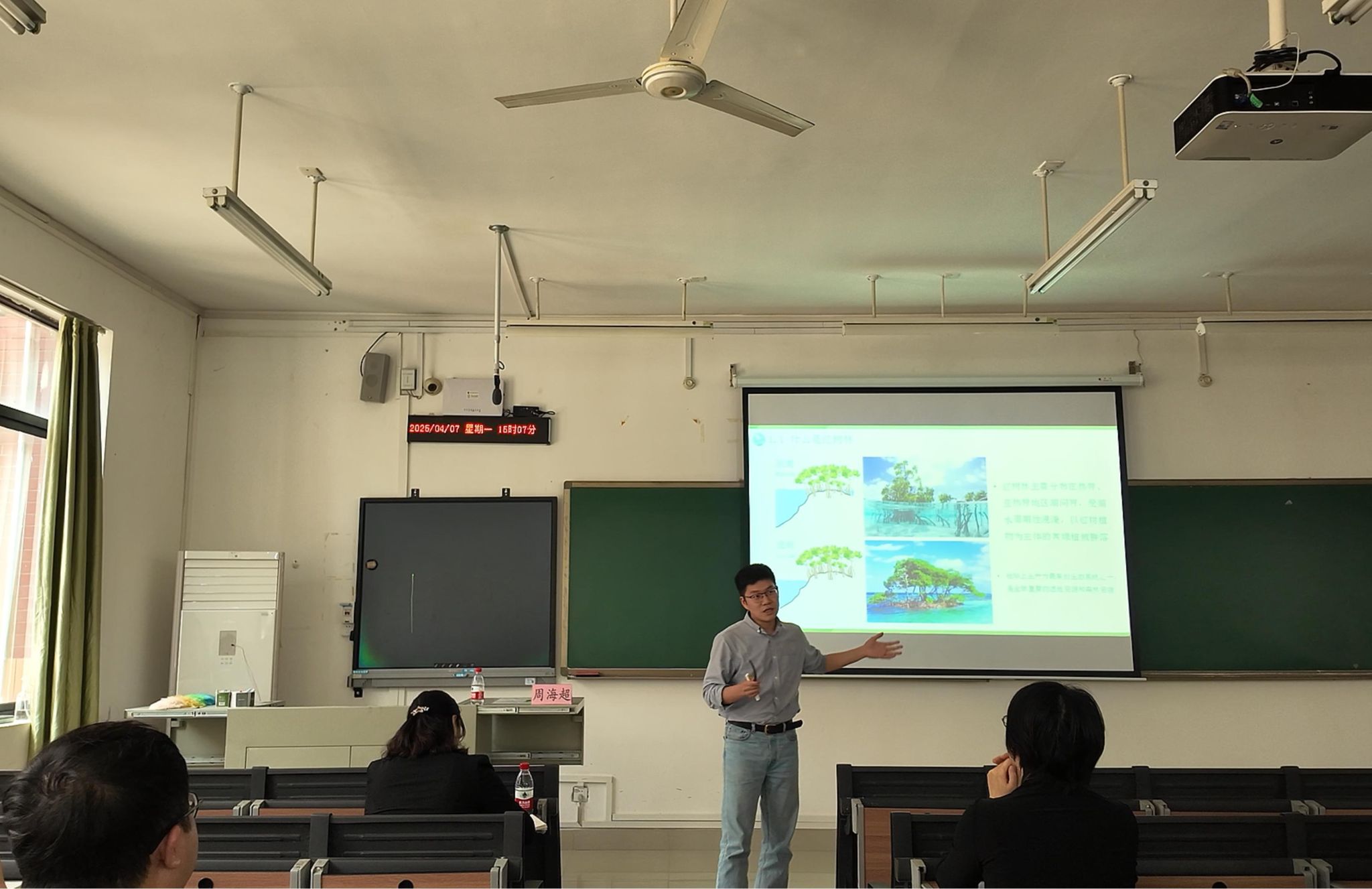 讲座中,周海超研究员向同学们详细介绍了红树林生态系统的独特价值。他通过丰富的图片以及实例,生动展示了红树林在净化海水、固碳护岸、维持生物多样性等方面的重要作用,并深入浅出地解释了红树林植物如何通过合成单宁、多酚等次生代谢产物适应特殊生存环境。此外,他还结合自身研究方向,分享了团队在红树林活性物质提取、功能开发及应用探索中的最新进展。