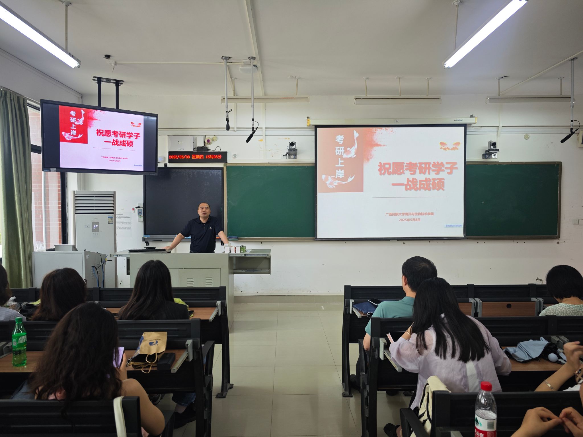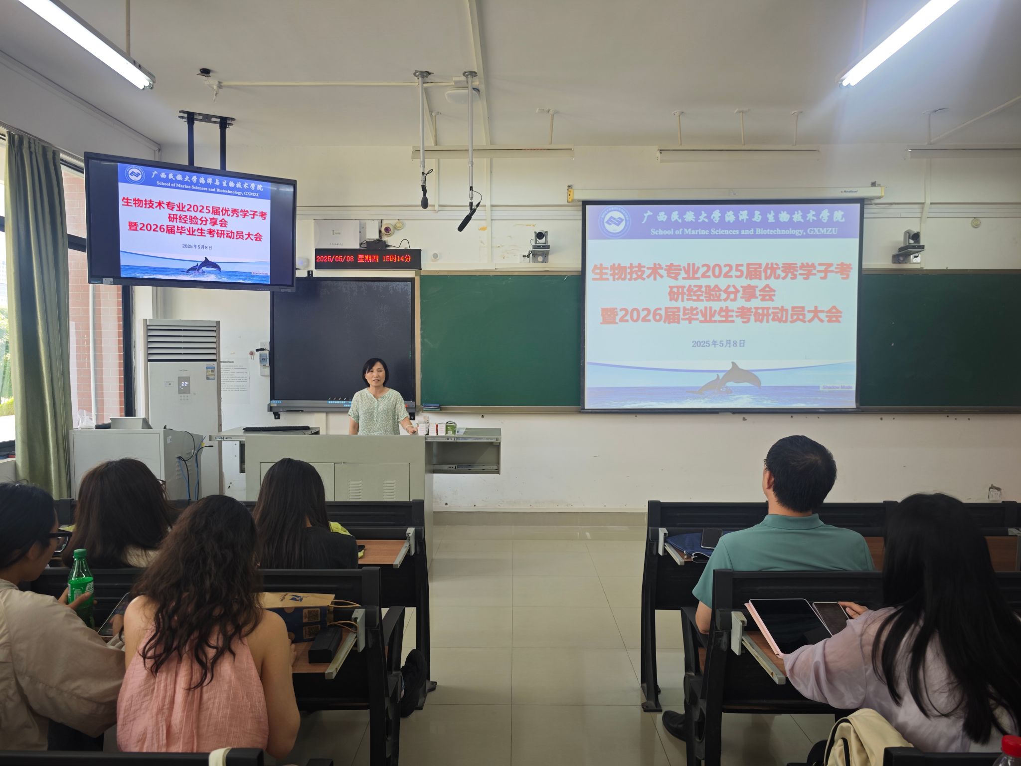 为激励考研学生的备考信心、激发考研斗志、鼓舞考研士气,fun88乐天使生物技术系于5月8日下午在明德楼208开展2026届毕业生考研动员大会暨考研经验分享会,学院党委书记刘红全、生物技术专业负责人何秀苗以及相关老师出席,会议由系主任许剑主持,2023级近150名同学参加分享会。