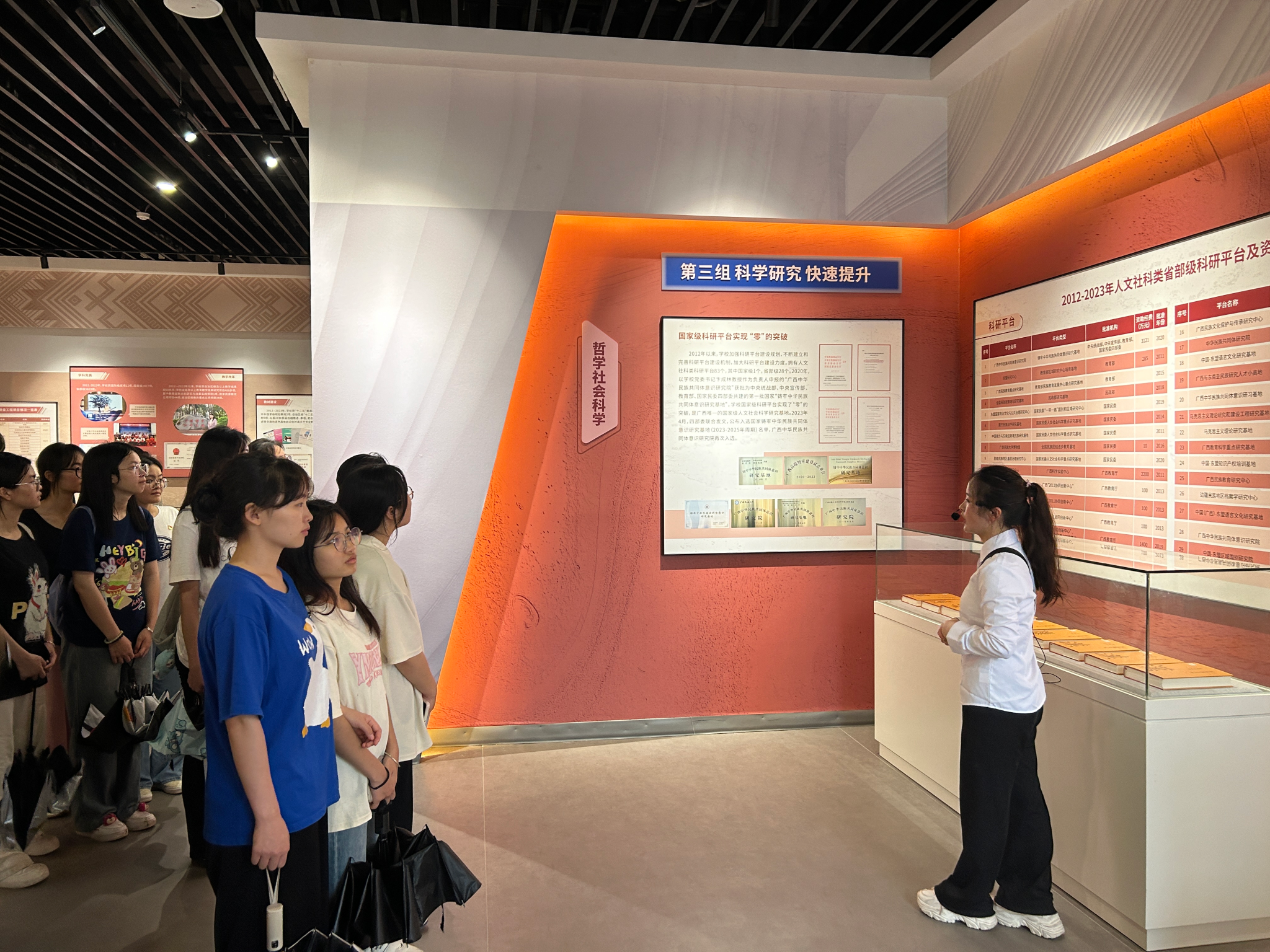 在讲解员的引导下,同志们有序进入校史馆,开始了这次意义非凡的学习之旅。讲解员带领各位同志回顾广西民族大学的建校发展历程,详细解读了领导寄语、历史荣誉等。此外,同志们还深入参观学校各个时期的办学成果展,认真听取学校在教学、科研和对外交流等方面取得的丰硕成果。这些珍贵的成果不仅是学校发展的基石,更是激励着一代又一代民大学子砥砺前行的动力源泉。