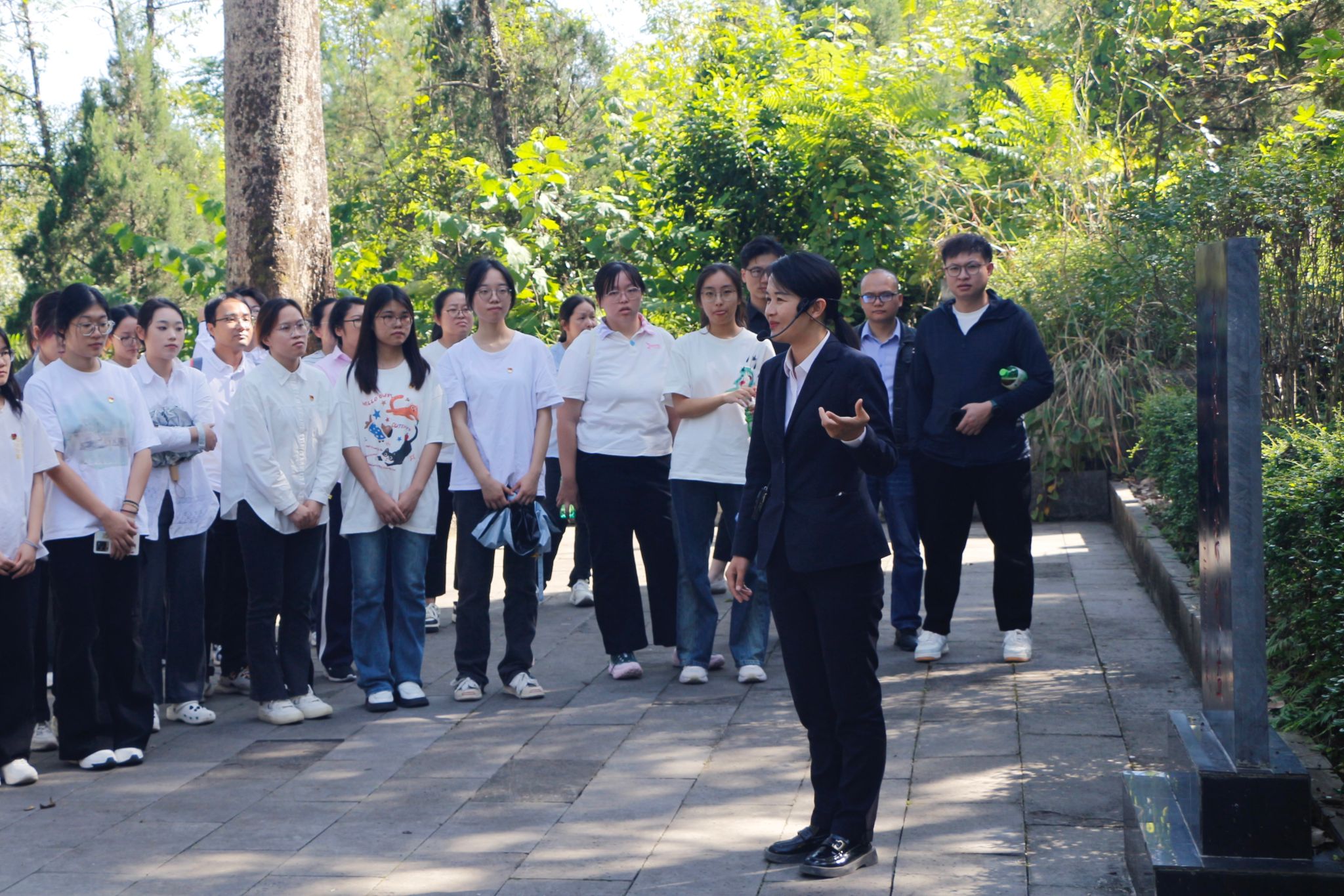 上午,师生党员抵达东兰县烈士陵园,怀着崇敬的心情瞻仰了韦拔群烈士墓和革命烈士纪念塔,向革命先烈默哀鞠躬,并重温入党誓词。下午,师生党员前往韦拔群故居、广西农民运动讲习所旧址(列宁岩)以及红七军前委旧址(魁星楼)等地参观。在参观过程中,讲解员向师生党员讲述了韦拔群的英雄事迹,韦拔群在革命道路上始终坚定信念,即使面对重重困难和牺牲,也从未动摇过对革命的信仰和追求,他先后创办了多届农民运动讲习所,为革命培养了大量优秀的农运骨干和军事人才,也为革命的胜利奠定了坚实的人才基础。他最善于联系群众,关心群众的疾苦,对人民解放事业,具有无限忠心的崇高感情。韦拔群以他的一生献给了党和人民的解放事业,他不愧是无产阶级和劳动人民的英雄。