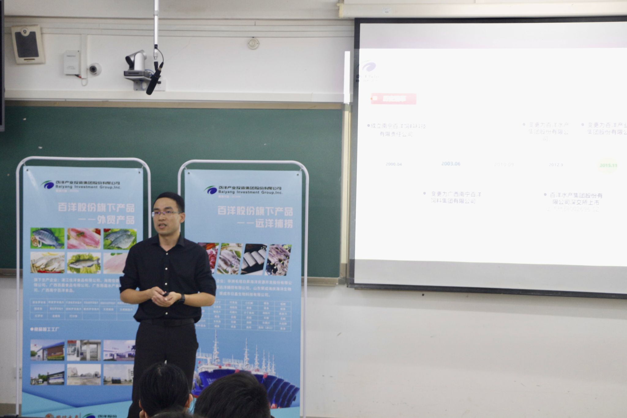 会上,石国中向同学们介绍了百洋集团股份有限公司概况、发展资质、校招要求,他就主要产业方面重点介绍了精深加工产品的种类、销售方向、品质要求等,提出菜品工业化新概念,并由合作目标向同学们阐述、分析水产品精深加工产业未来的发展方向。